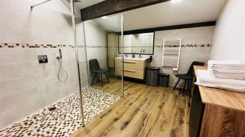 A l'étage vous découvrirez un hall de circulation 3 chambres spacieuses avec dressing, une vaste salle d'eau douche italienne et cabinet de toilette.