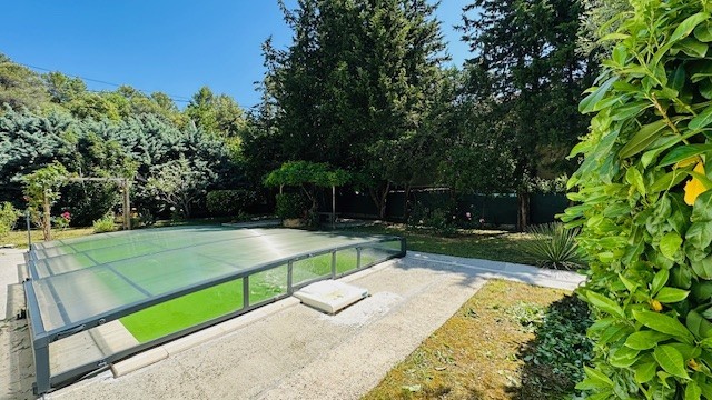 La piscine 8x4 est dotée d'un liner beige de 2024, couleur de l'eau rivière, abris dôme pour profiter de la piscine en intersaison.