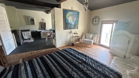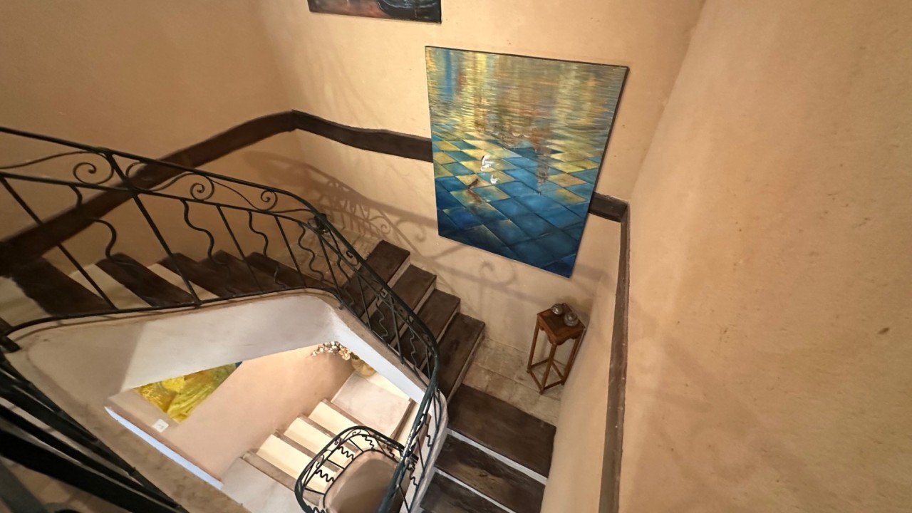 -Un hall de passage avec son escalier d'origine reliant les étages dessert une chambre d'env.15m² ouvrant sur la terrasse exposée Sud dotée de sa salle d'eau privative avec douche et wc.