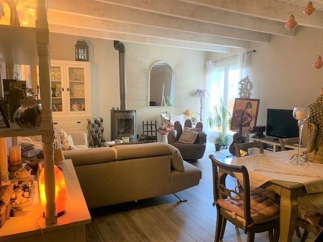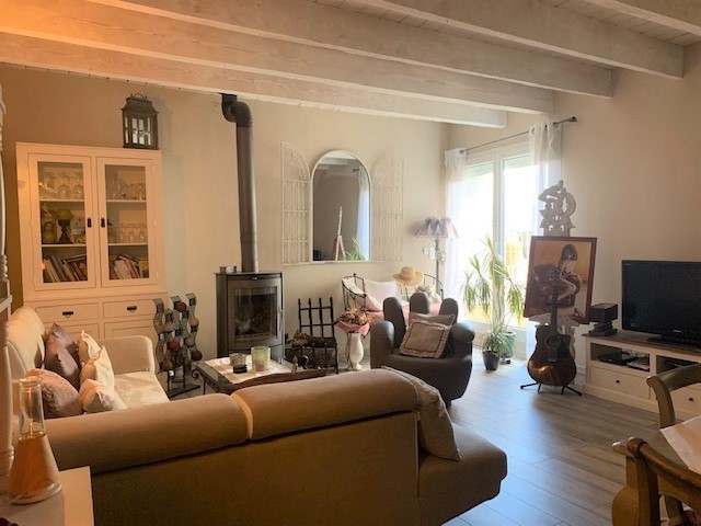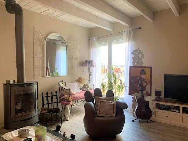 En ré de terrasse : Une cuisine équipée aménagée ouvrant sur un espace dinatoire 16m²-Un séjour salon salle à manger de 33m² avec un poêle à bois ouvrant sur la terrasse par une baie vitrée-Un cabinet de toilette