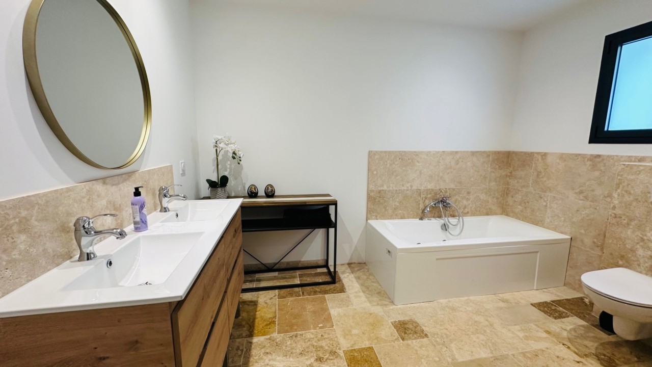 -A l'étage : Un hall de circulation- 2 chambres ouvrant sur une terrasse solarium avec vues panoramiques et imprenables - Une salle d'eau douche (douche et bain) - Un cabinet de toilette indépendant-