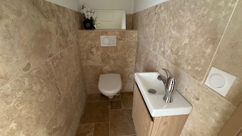 - Une Vaste Pièce à vivre traversante comprenant un espace salon /salle à manger/ cuisine dinatoire entièrement équipée aménagée, le tout ouvrant sur la terrasse par une baie en galandage-