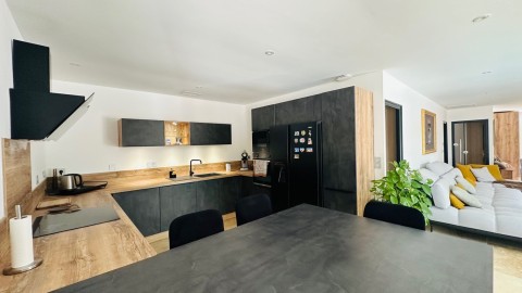 -Pièce à vivre de 90m² Salon TV- Cuisine équipée aménagée-Salle à manger-2eme salon avec grandes baies vitrées et vues sur la Cité médiévale.