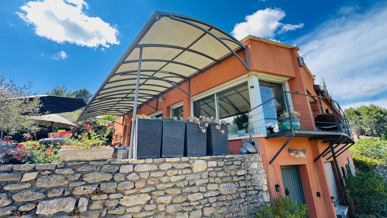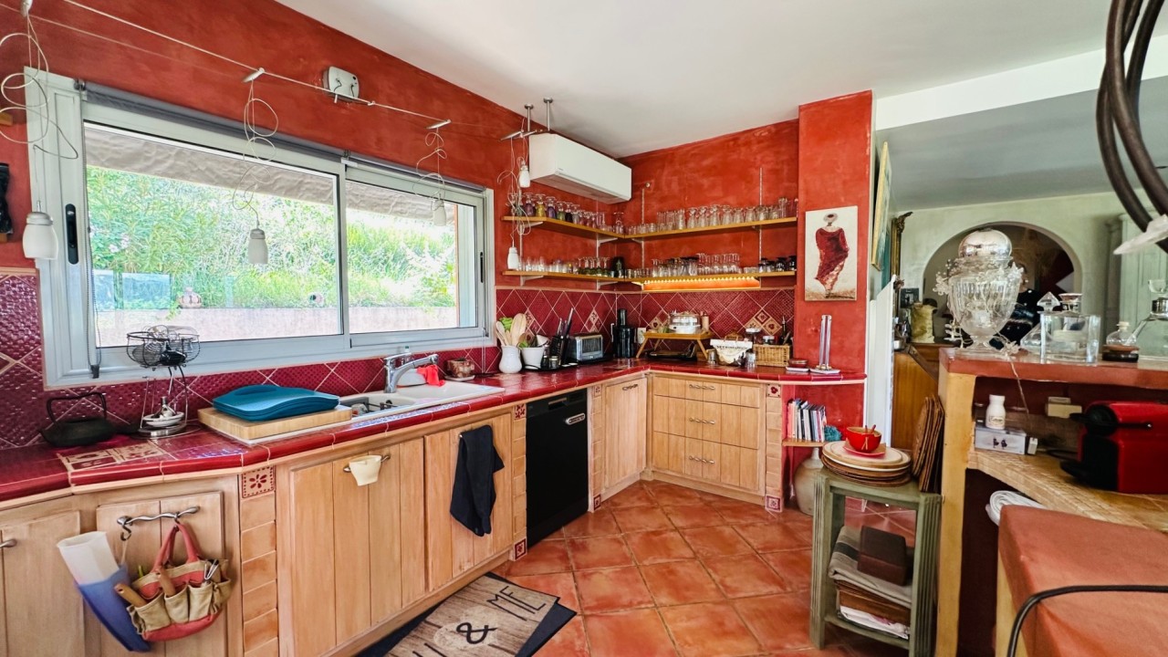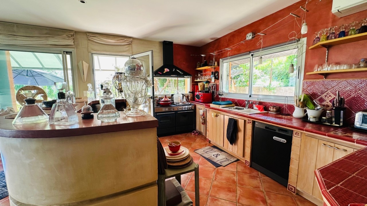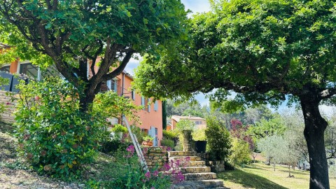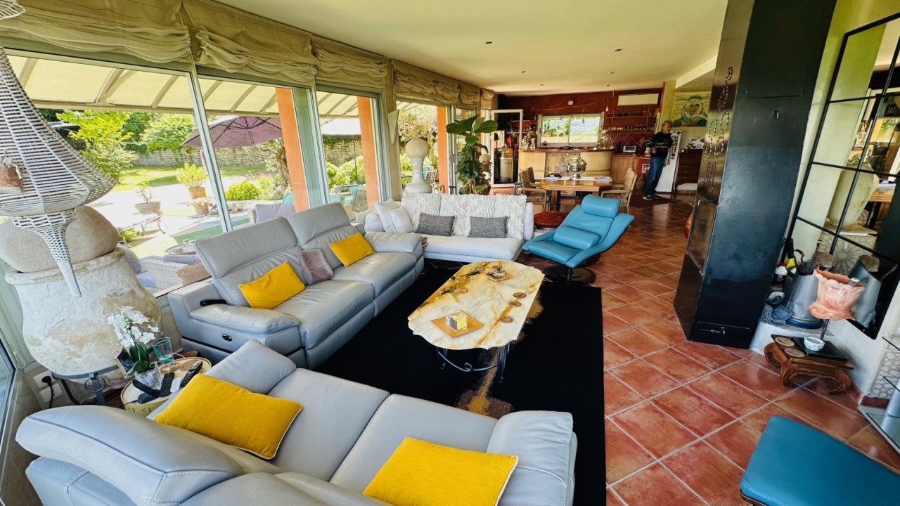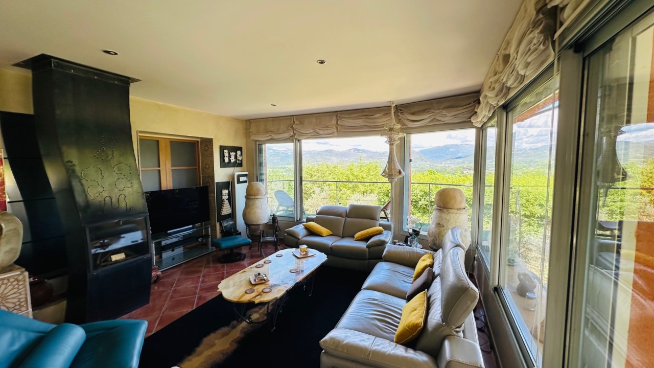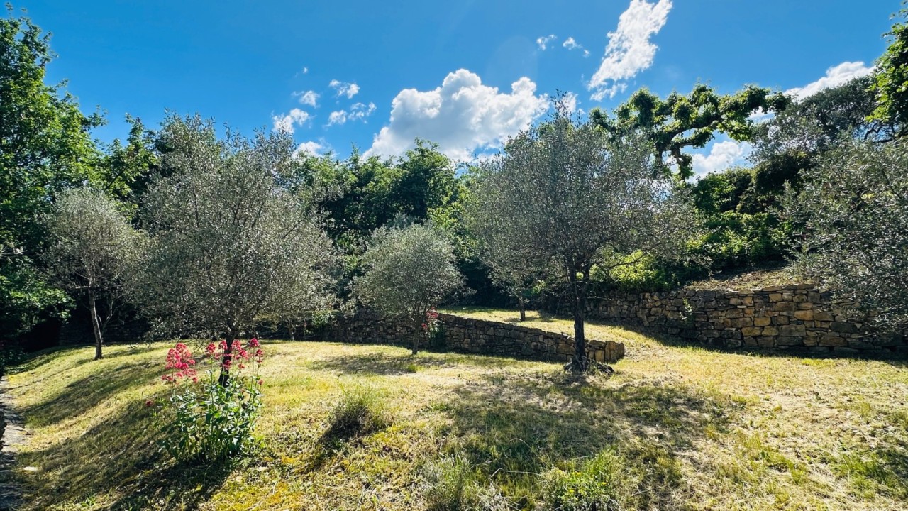 Idéalement située sur les hauteurs offrant des vues imprenables, au cœur de 3990m² de terrain arboré d'essences méditerranéennes, 73 oliviers, boisé de chênes centenaires, dans un cadre naturel idyllique aux essences méditerranéennes, le tout dans une atmosphère bucolique et raffinée. Cette élégante maison d'environ 220 m² édifiée sur un terrain en position dominante entourée de ses murets en pierres sèches offre de superbes volumes au confort moderne : un vaste salon salle à manger de 90m² baigné de lumière par ses baies vitrées, une cuisine ouverte le tout donnant directement sur la terrasse de 70m² dotée d'une toile imperméabilisée et le jardin.
