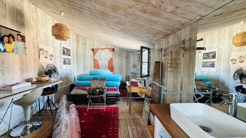 -Pièce à vivre 90m² comprenant un salon tv avec cheminée d'artiste à foyer fermé ouvrant sur balcon et sur la vaste terrasse, une salle à manger, espace bureau.